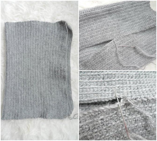 Fold rectangle in half and get ready to whip stitch the short ends together (blocking the rectangle flat with hot steam is optional). Using yarn tail and bent tip tapestry needle, whip stitch back loops of one side to front loops of the other side. Flip tube inside out to make the seam less visible. Using yarn tail, weave needle in and out of the edges of the rows where the opening is located. Once yarn tail has gone around the entire circular opening, pull tight to cinch the opening shut. Use the yarn tail and needle to close up any gaps that are still remaining.