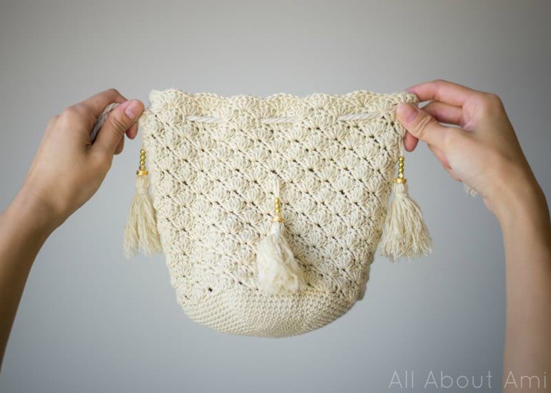 We decided to add four tassels for an elegant and decorative effect! See how to create tassels in my tutorial HERE. We added some gold hardware to this reticule by stringing some gold beads on the string ontop of the tassel! We tied the tassels around the bag so that they were equidistant, with two being higher than the other two. This way, when the bag was pulled shut, it created a neat effect with the tassels at varying heights. We pulled the strands of the tassels apart to give them a fuller look, just as we did with the fringe of the Boho Crochet Wrap HERE. You can use a comb to separate the strands as well!