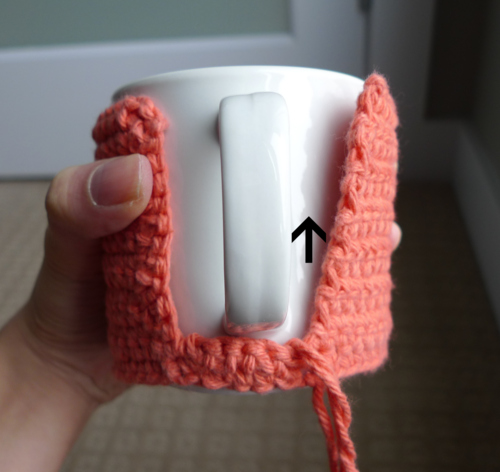 Wrap the crocheted piece around the cup (to visualize where you’ll be crocheting). Make sure that the top edge of the piece has the “v’s” showing outwards (flip if necessary). Single crochet down the left side.