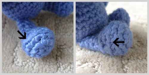 I added a slight extra detail on the feet by crocheting in the back loops only for a certain row, thereby leaving the front loops out to give an edge, helping to define the feet more.