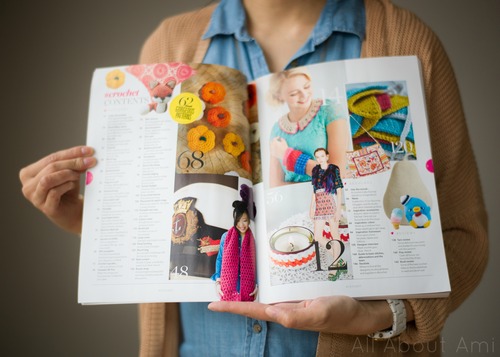 I was immediately impressed by the weight and feel of the magazine as it is dense with 148 pages (since it’s a quarterly magazine). The #crochet team did a beautiful job with the layout of this magazine as it is visually very appealing and sharp-looking. The table of contents shows that this launch issue contains 62 patterns as well as a picture of me wearing my “Long Double Crochet Cowl”! You may also spot Amigurumei’s “Tuxedosam” as they’ve included an excerpt as well as a review of Mei’s new book “Hello Kitty Crochet”.