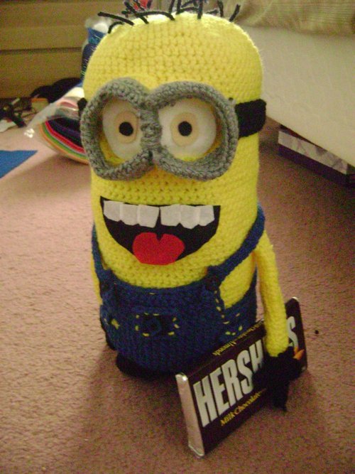 Tiffany’s Minion is holding a massive chocolate bar! I think he was sent on a secret mission by Gru to bring back enough chocolate for the girls 🙂 He looks so cute just standing in the middle of the room, chilling with his chocolate bar!