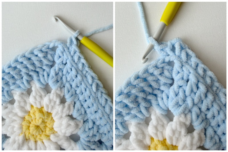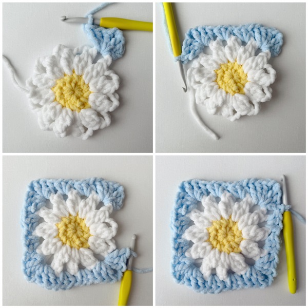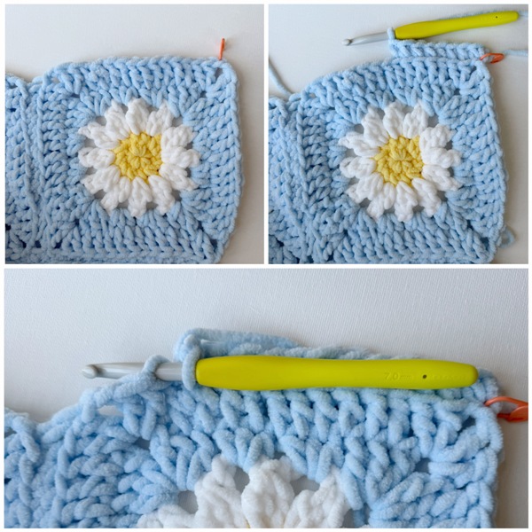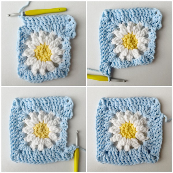 - Note that there are YouTube videos available demonstrating how to crochet the entire daisy granny square HERE and how to seam the squares together and crochet the border HERE!