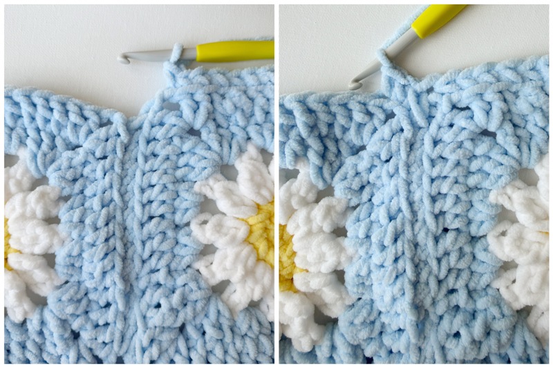 Work extended single crochets in areas between the granny squares to make the height of the stitches the same as the rest of the stitches (to help fill in the “dips” between the granny squares).