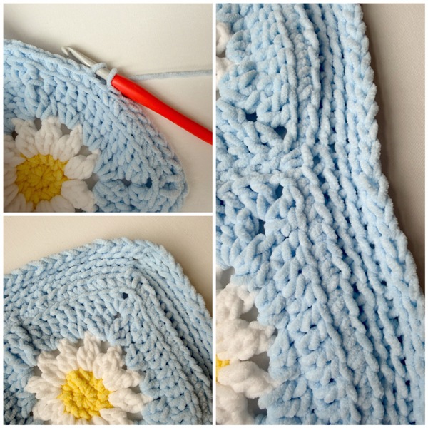 The border is worked in joined rounds with the right side of the blanket facing you.
