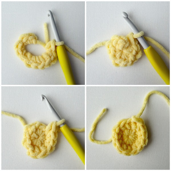 R2: Chain 1, sc in same st. Sc around. Sl st to first sc. Fasten off. (12 sts)