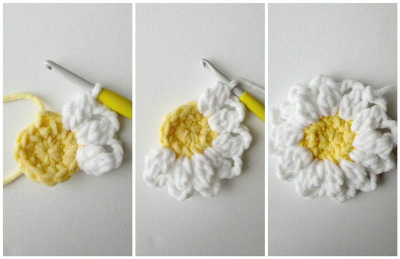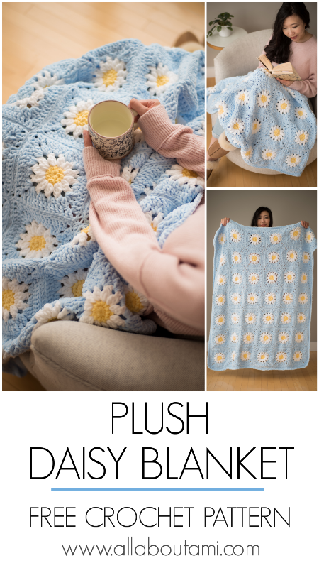 Pattern Description: Crochet this gorgeous daisy blanket using plush chenille yarn! This soft and textured blanket will brighten up your home and add a touch of nostalgia!