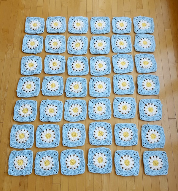 Arrange the 42 granny squares together in a rectangle as shown below (6 squares by 7 squares).