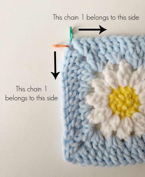 - When whip stitching the granny squares together, I split the chain 2’s in each corner: one chain 1 belongs to one side of the granny square while the other chain 1 belongs to the other side of the granny square.