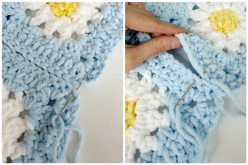 [Note that this is the same pattern as the “Cozy Days Daisy Blanket” using blanket yarn and different crochet hook sizes. The plush chenille yarn is a good alternative if you are allergic to wool or you want a soft and durable blanket yarn that will not fuzz up easily!]