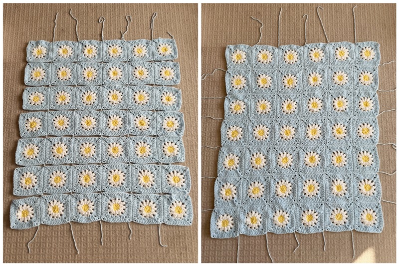 - Once all 42 granny squares have been seamed together, it is time to work the border.