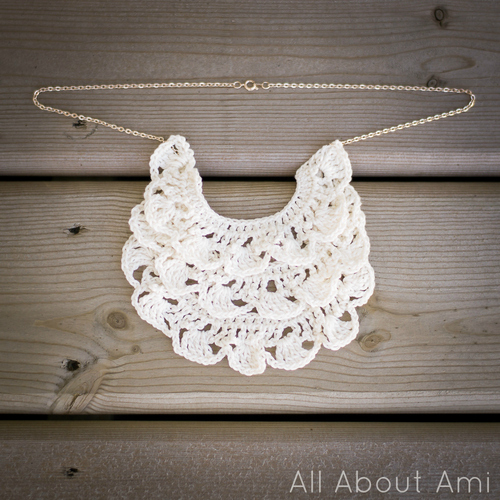 While looking for a good bib pattern on Ravelry (see the ones I ended up crocheting for Myla here), I stumbled upon a free pattern for a beautiful ruffled crochet bib necklace by Stefanie of “A Common Thread”. I absolutely love jewelry and all things ruffly, delicate and dainty, so I was thrilled by the idea of crocheting my own necklace! I love using Patons Grace yarn as the soft mercerized cotton gives a very lustrous finish- I’ve built up quite the collection of colours 🙂 I opted for this cream colour since I wanted my layers to look like delicate lace!