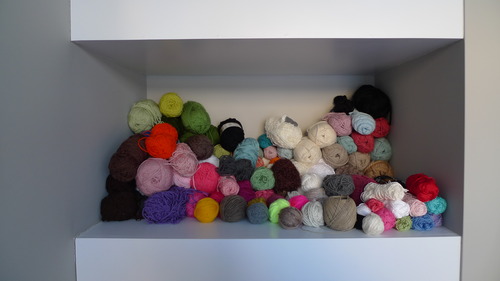 For a while I just placed all my skeins of yarn on the shelf like so! However, there was still a lot of yarn getting lost in the back and underneath so I knew this wasn’t a great solution. It just looked like one big mess of yarn!