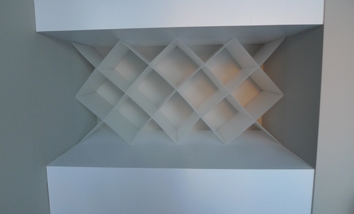 In addition, each piece needed to have notches made in them so that they could be later connected together. A notch was needed wherever the lines intersected as represented by the green dots in the picture above. As you can see, the short pieces (blue lines) each needed one notch while the long pieces (light pink lines) each needed three notches.